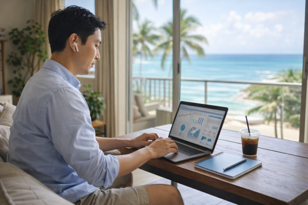 沖縄で収入を上げる方法の一つとして、リモートワークで本土の企業に勤務する働き方があります。ITやWeb系の仕事であれば、場所に関係なく働けるケースも増えています。