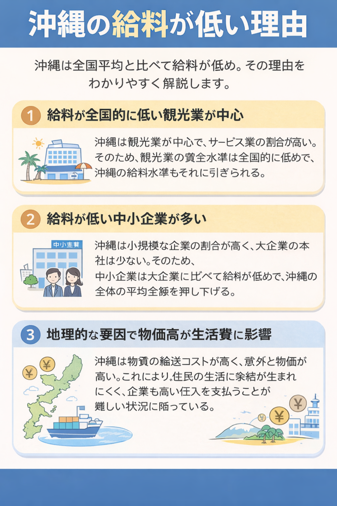 沖縄は観光業やサービス業が中心の地域であり、全国的に給与が低い業種の割合が多いことが平均年収の低さにつながっています。また、本社機能を持つ大企業が少ないことも影響しています。そのため、全体の給与水準が全国平均より低くなる傾向があります。